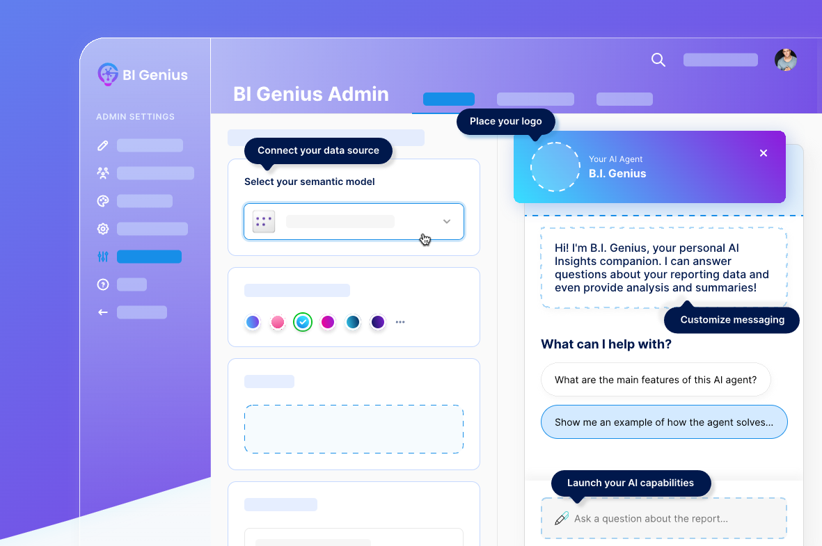 Whether you want to enhance your internal reporting or deliver branded AI experiences to customers, BI Genius is designed to fit seamlessly into your ecosystem.